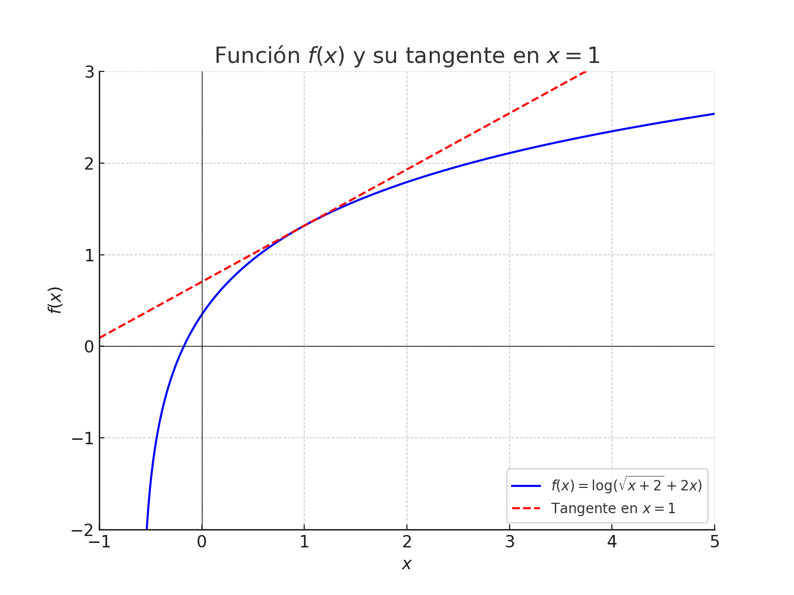 Ejemplo: Calcular la tangente a la función \(f(x)=\log \left(\sqrt{x+2}+2x\right)\), en \(x=1\)