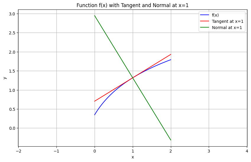 Ejemplo: Calcular la normal a la función \(f(x)=\log \left(\sqrt{x+2}+2x\right)\), en \(x=1\)